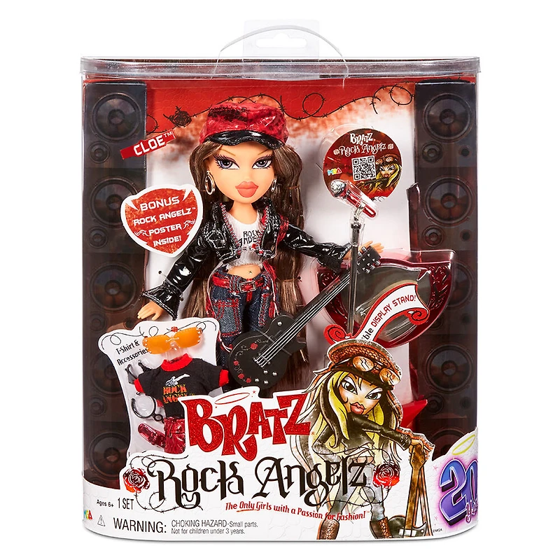 #TBT when the Bratz made their super stylin' debut as a rock band! In celebration of Bratz turning 20 yearz old, you can collect replicas of the Bratz Rock Angelz. Collectors and new Bratz fans can celebrate 20 years of the Girls with a Passion for Fashion with this beloved line. From the rockin' outfits to the collectible guitars, they're near exact replicas of the iconic rock band. Now in special edition packaging with a 20 yearz motif! Each doll includes 2 outfits- one for rockin' out on stage, and one for chillin' out after the show. Also includes a faux leather jacket, hat, shoes, guitar, microphone with stand, display stand, sunglasses, tons of jewelry, and more! In addition to their rockstar looks, each doll also includes a hairbrush and poster. Rock out with Cloe and the rest of the Bratz Rock Angelz! Collect all 5 Bratz Rock Angelz dolls and the Bratz Rock Angelz Cruiser.