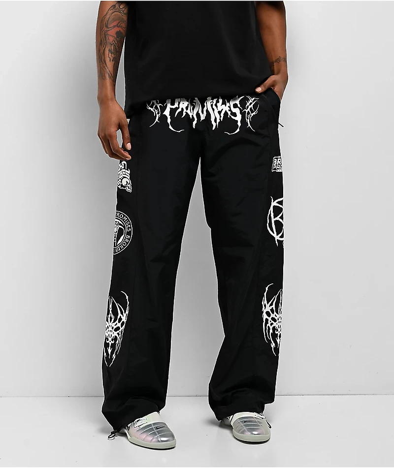 At the intersection of edgy and athletic, the Cybersport windbreaker pants from Broken Promises land in a solid black nylon construction with screen-printed graphics on the front and sides for a tough streetwear vibe. Lightweight and loose-fitting, t
