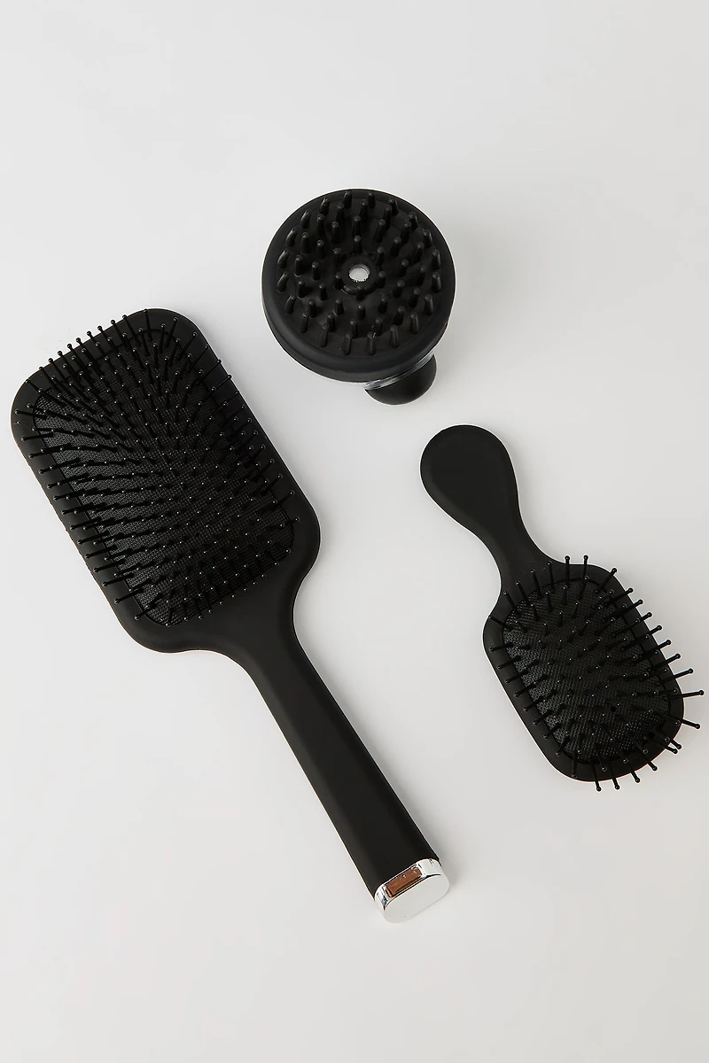 This 3-piece brush set comes with a paddle brush, mini brush, and diffuser brush. Imported