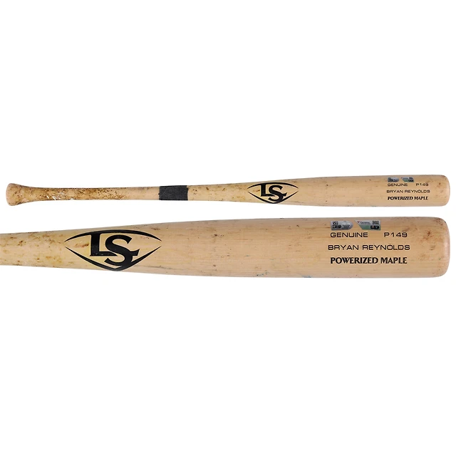 Bryan Reynolds, batte de baseball des Pirates de Pittsburgh, Tan Louisville Slugger, utilisée lors du match contre les Diamondbacks de l'Arizona, le 25 juillet 2025