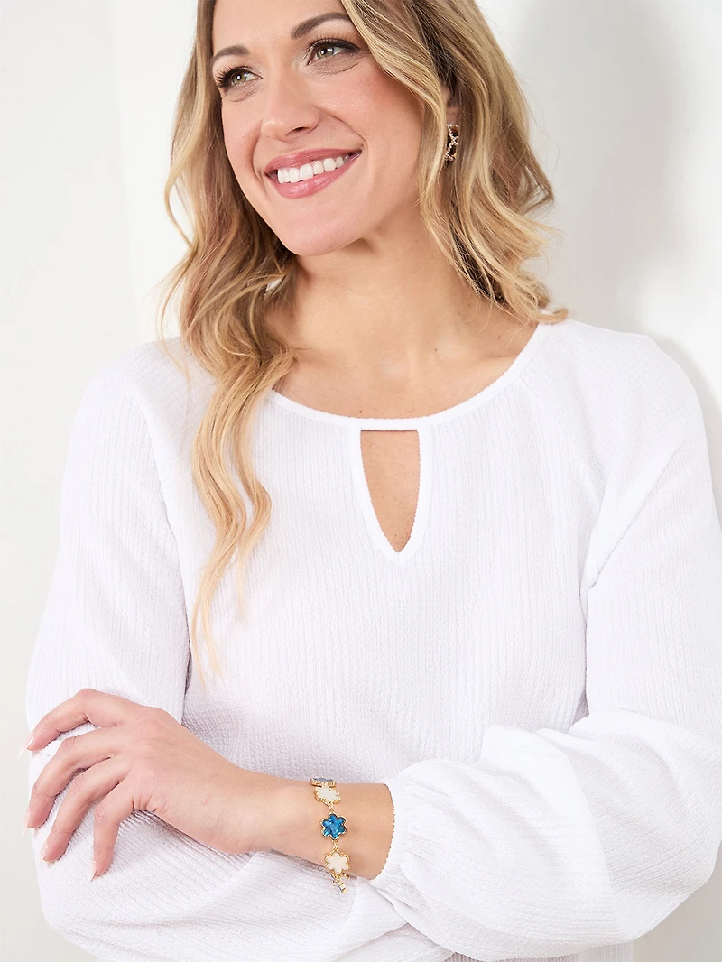 The Bubble Hem Keyhole Top is a must-have for easy style, with its relaxed fit and playful elasticized hem that sits comfortably at the hips. Featuring a scoop neck
