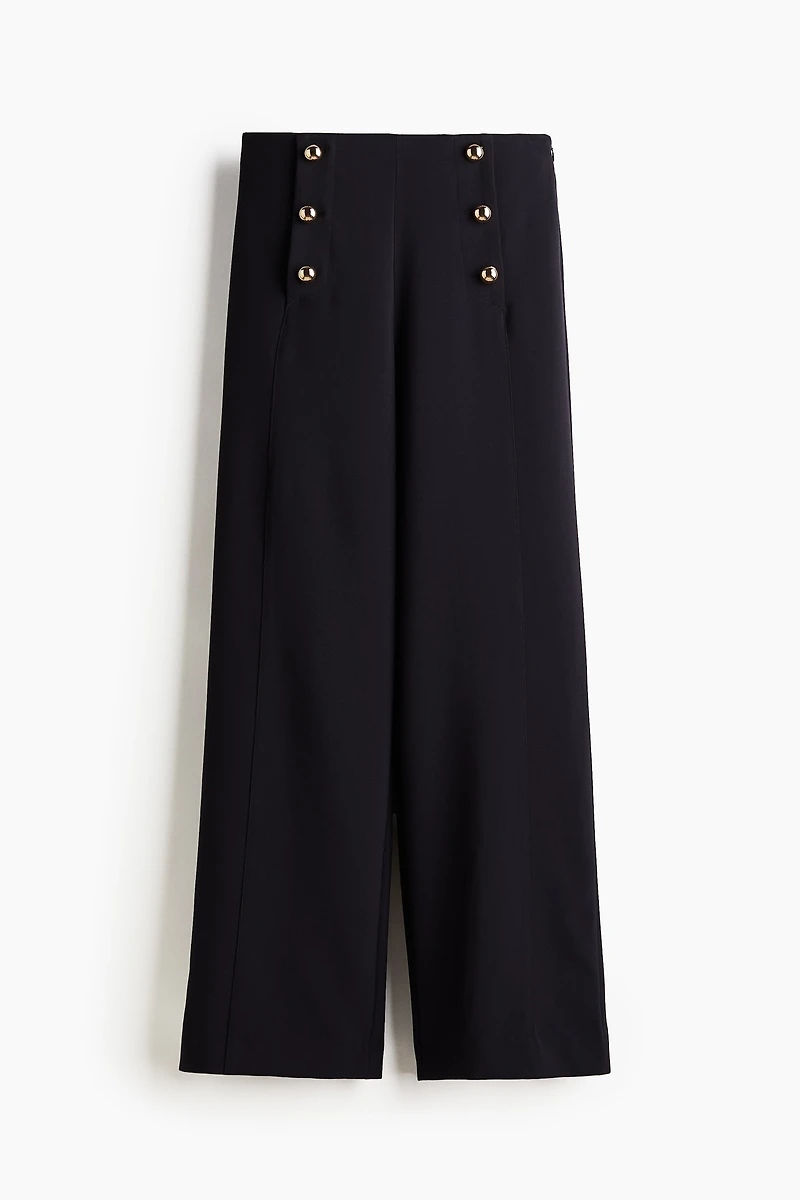 Pants in twill. High waist, decorative gold-colored buttons at front, concealed zipper at one side, and welt back pockets. Wide legs with visible seams at front.