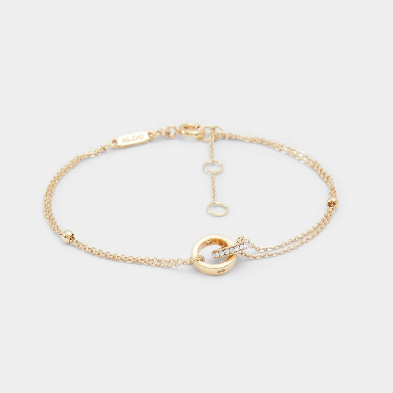 Interlocking gold chains cradle a rhinestone circle pendant, turning the bracelet into a tiny constellation that catches light with every move and adds a gallery-worthy shimmer to day-to-night wear. Layer it with a silk blouse for polished elegance, or stack it with slim bangles to frame an evening slip for instant after-dark drama.