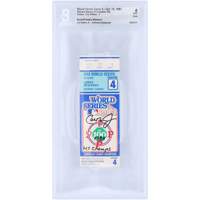 Cal Ripken Jr. Baltimore Orioles Autographed World Series Game 4 Stub Beckett Fanatics Witnessed Authenticated Ticket from October 15, 1983 with "1983 WS Champs" Inscription