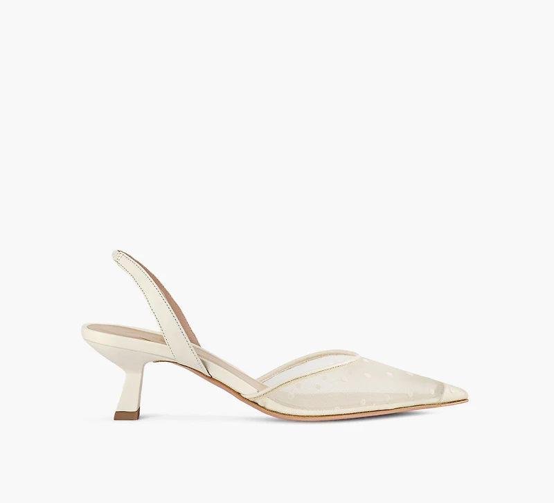 The Browns Couture Cannelle slingback brings a refined, feminine touch to dressy looks. Designed with a pointed toe, delicate mesh detailing and a sculpted mid heel, it offers a polished silhouette that transitions effortlessly from day to evening.