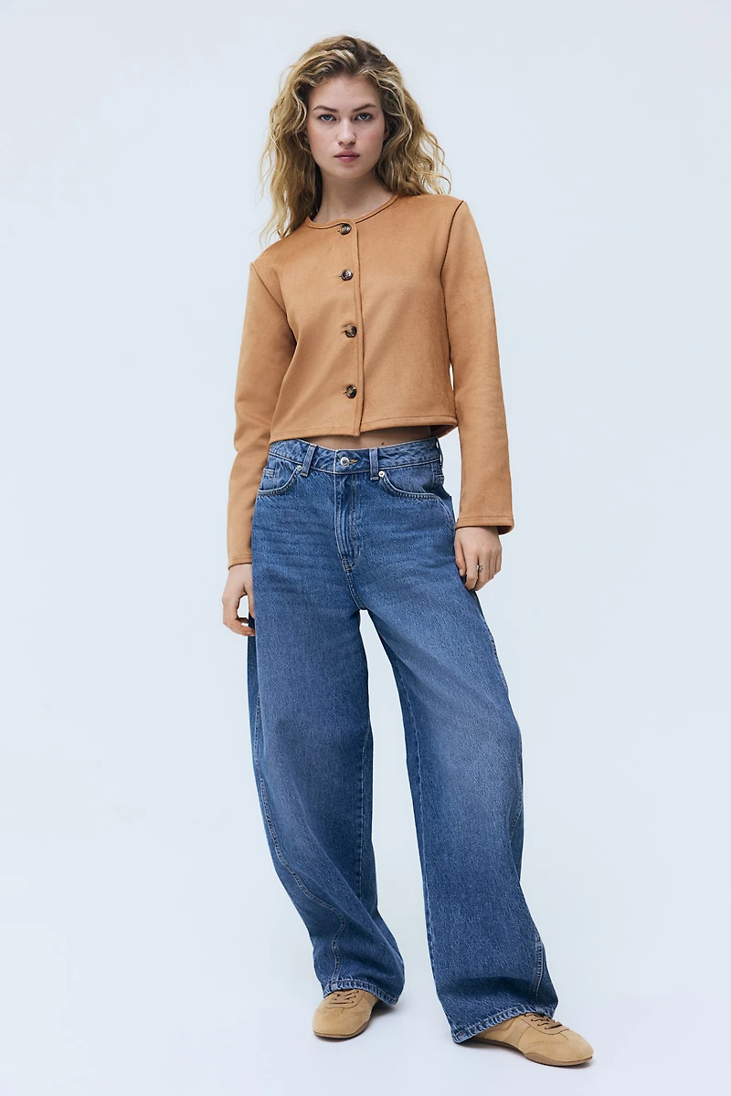 Cardigan in thick jersey with a soft, napped finish. Round neckline, buttons at front, and narrow trim at neckline and along placket.