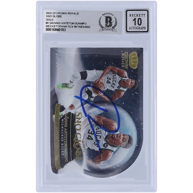 Carte authentifiée 10 signée Giannis Antetokounmpo Milwaukee Bucks 2022-23 Panini Crown Royale Sno Globe Gold #8 #10/10 Beckett Fanatics Witnessed