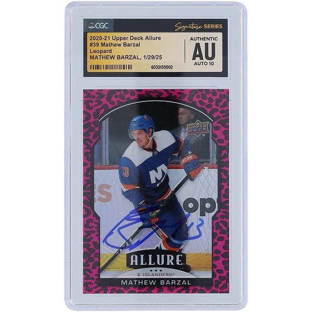 Carte autographiée 2020-21 Upper Deck Allure Leopard #39 de Mathew Barzal des Islanders de New York, carte autographe authentifiée CGC Fanatics Witnessed Auto 10