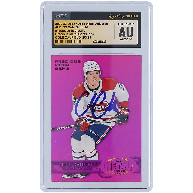 Carte autographiée Cole Caufield des Canadiens de Montréal 2022-23 Upper Deck Metal Universe, exclusive aux employés, pierres précieuses en métal précieux rose #UD-CC, carte Auto 10 authentifiée CGC Fanatics Witnessed