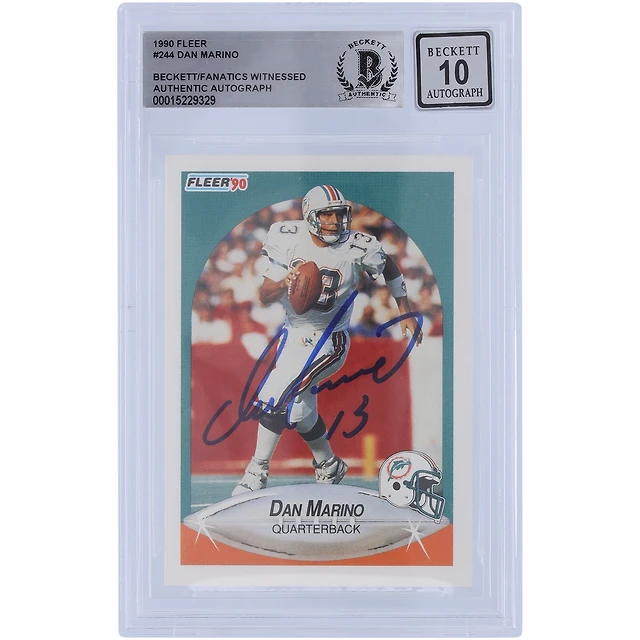 Carte autographiée de 1990 Fleer #244 de Dan Marino Miami Dolphins, fanatiques de Beckett, authentifiée et témoin