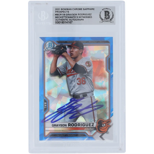 Carte autographiée des Bowman Chrome Prospects Sapphire 2021 des Orioles de Baltimore, numéro BCP-118, signée par Grayson Rodriguez et signée Beckett Fanatics.