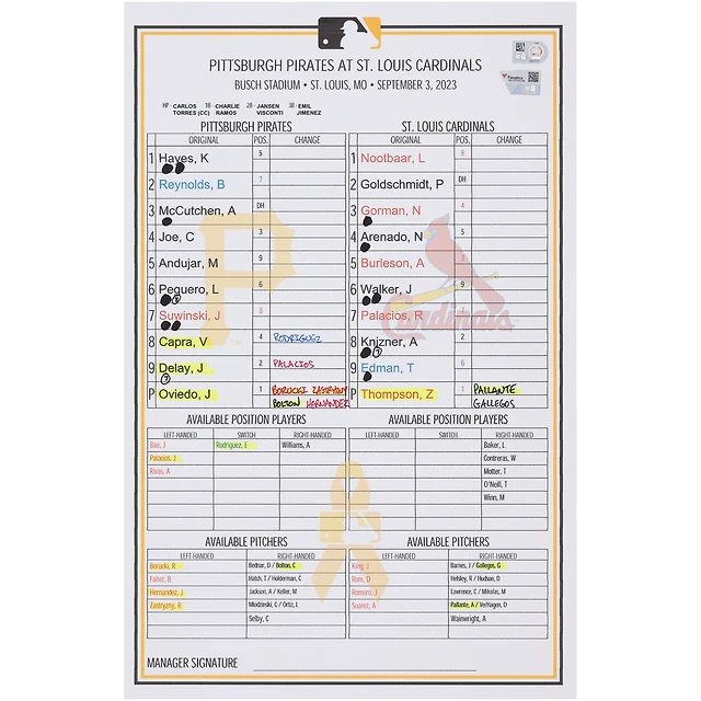 Carte de composition des équipes des Pirates de Pittsburgh contre les Cardinals de Saint-Louis le 3 septembre 2023