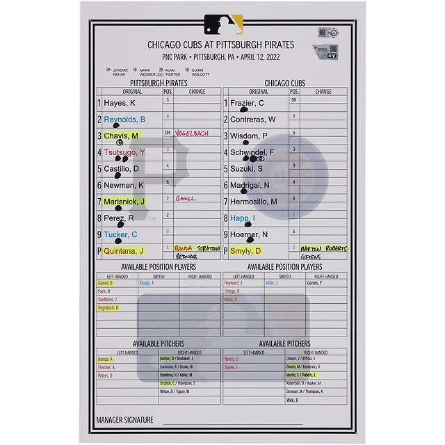Carte de composition des équipes des Pirates de Pittsburgh contre les Cubs de Chicago le avril 2022