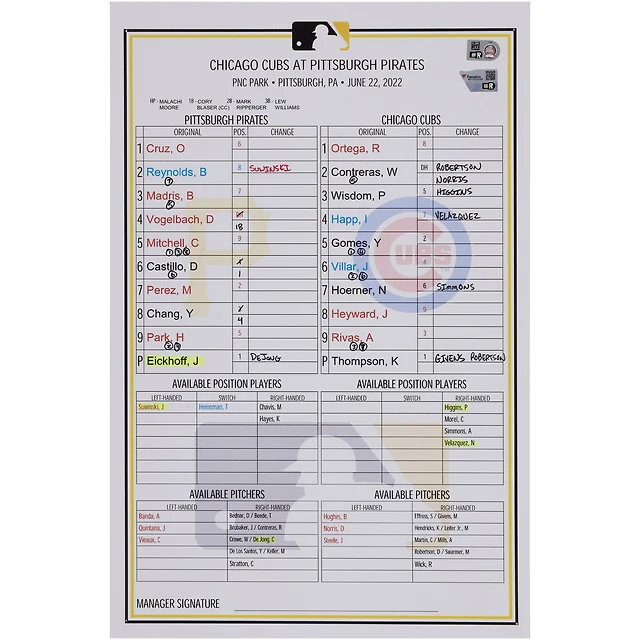 Carte de composition des équipes des Pirates de Pittsburgh contre les Cubs de Chicago le juin 2022