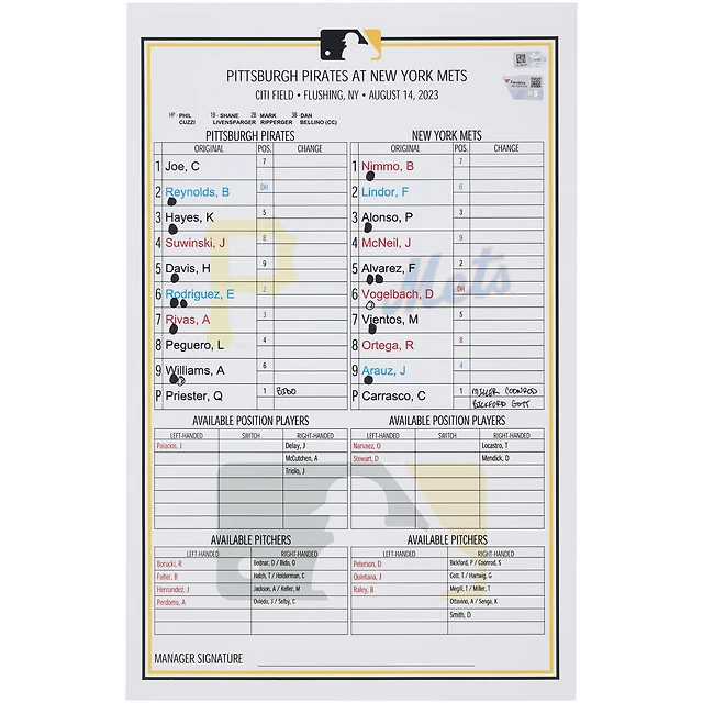 Carte de composition des équipes des Pirates de Pittsburgh contre les Mets de New York le août 2023