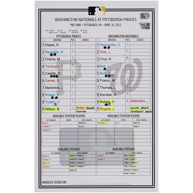 Carte de composition des équipes des Pirates de Pittsburgh contre les Nationals de Washington le avril