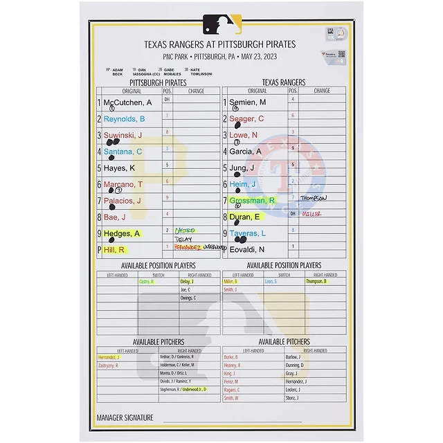 Carte de composition des équipes des Pirates de Pittsburgh contre les Rangers du Texas le mai 2023