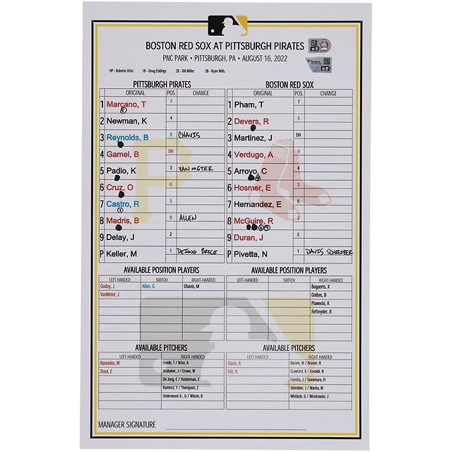 Carte de composition des équipes des Pirates de Pittsburgh contre les Red Sox de Boston le août 2022