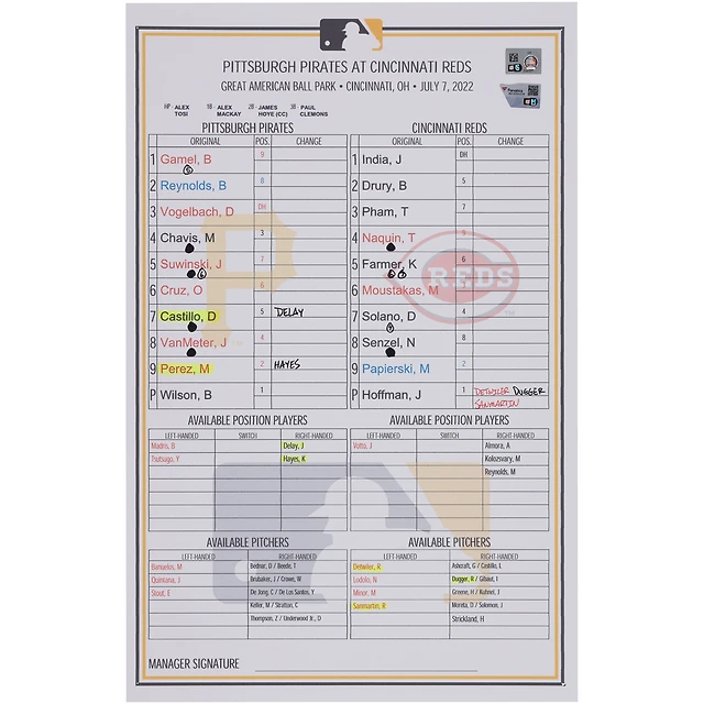 Carte de composition des équipes des Pirates de Pittsburgh contre les Reds de Cincinnati le 7 juillet 2022