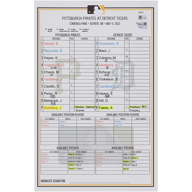Carte de composition des équipes des Pirates de Pittsburgh contre les Tigers de Détroit le 4 mai 2022 - Deuxième match du programme double