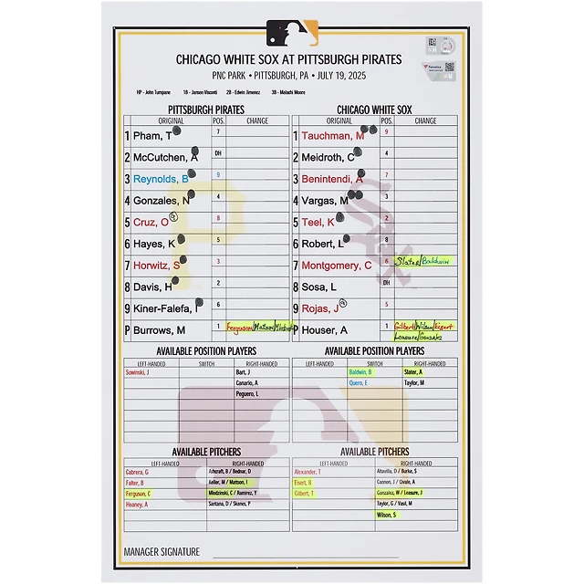 Carte de composition des équipes des Pirates de Pittsburgh contre les White Sox de Chicago, le 19 juillet 2025