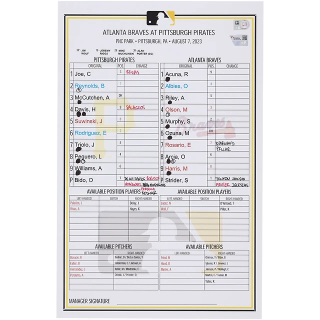 Carte de composition des équipes des Pirates de Pittsburgh lors du match contre les Braves d'Atlanta le 7 août 2023
