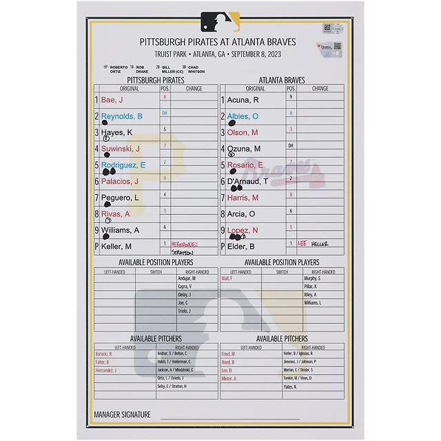 Carte de composition des équipes des Pirates de Pittsburgh lors du match contre les Braves d'Atlanta le septembre 2023