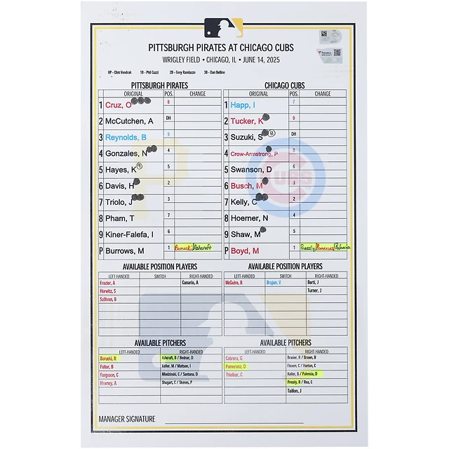 Carte de composition des équipes des Pirates de Pittsburgh lors du match contre les Cubs de Chicago