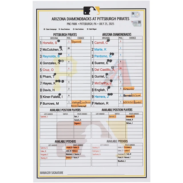 Carte de composition des équipes des Pirates de Pittsburgh lors du match contre les Diamondbacks de l'Arizona, le 25 juillet 2025