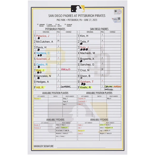 Carte de composition des équipes des Pirates de Pittsburgh lors du match contre les Padres de San Diego le 27 juin 2023
