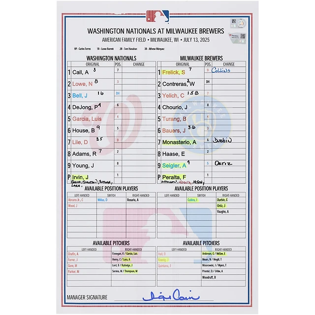 Carte de composition des Nationals de Washington lors du match contre les Brewers de Milwaukee, le 13 juillet 2025