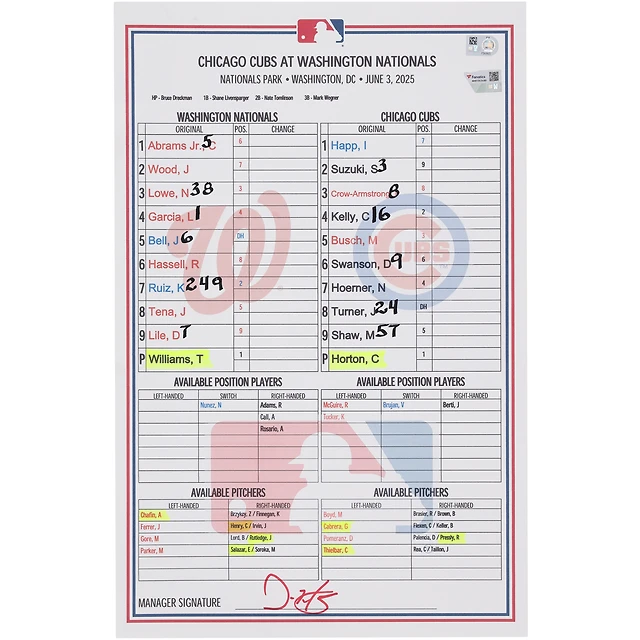 Carte de composition des Nationals de Washington lors du match contre les Cubs de Chicago