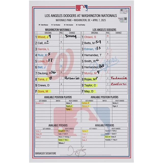 Carte de composition des Nationals de Washington lors du match contre les Dodgers de Los Angeles, le 7 avril 2025