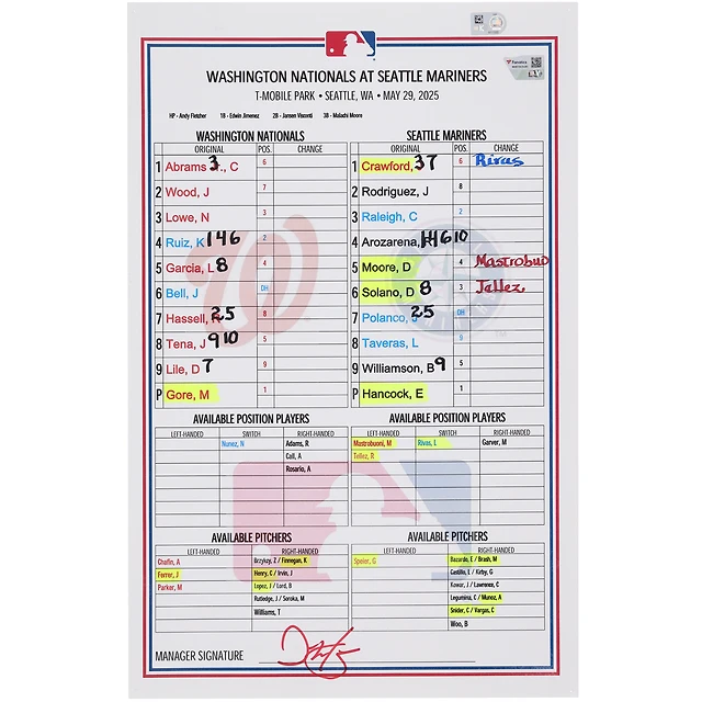 Carte de composition des Nationals de Washington lors du match contre les Mariners de Seattle, le 29 mai 2025
