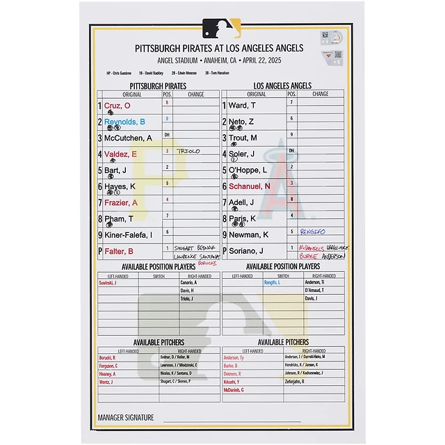 Carte de composition des Pirates de Pittsburgh contre les Angels de Los Angeles, le 22 avril 2025
