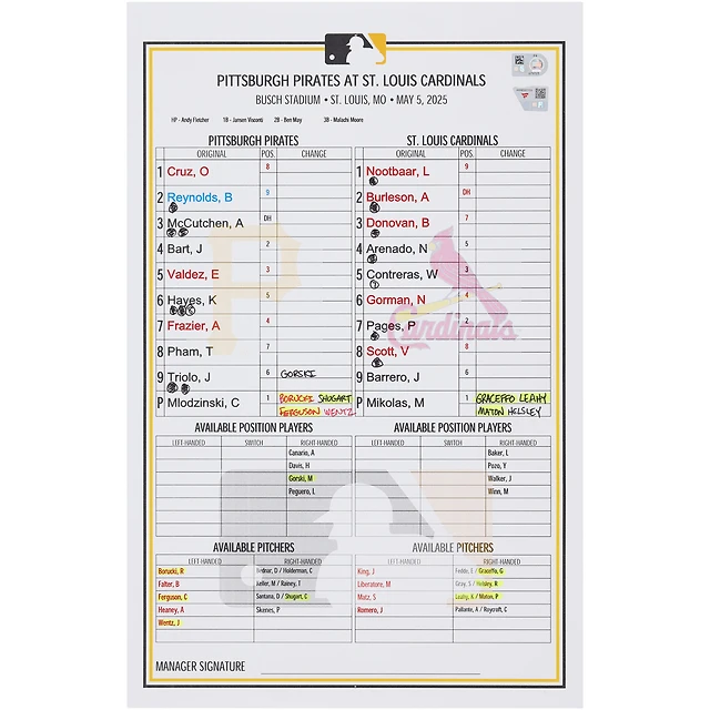 Carte de composition des Pirates de Pittsburgh lors du match contre les Cardinals de Saint-Louis