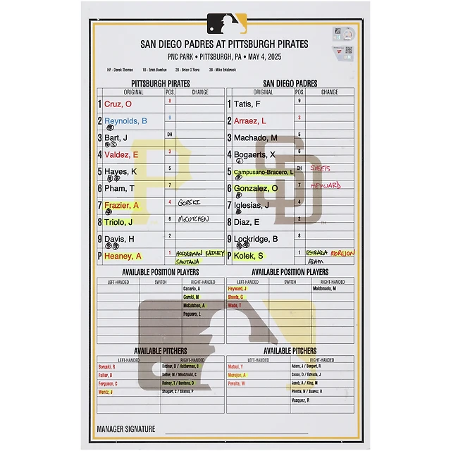 Carte de composition des Pirates de Pittsburgh lors du match contre les Padres de San Diego