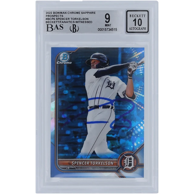 Carte de recrue 9/10 authentifiée 2022 Bowman Chrome Sapphire #BCP6 signée Spencer Torkelson par les Detroit Tigers et vue par les fanatiques de Beckett