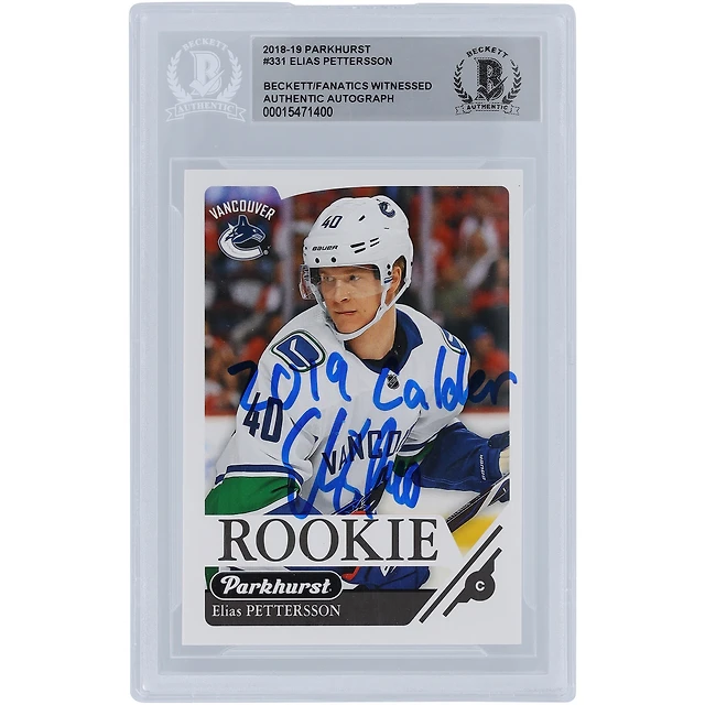 Carte de recrue authentifiée 2018-19 Upper Deck Parkhurst #331 signée Elias Pettersson par les Canucks de Vancouver avec l'inscription « 2019 Calder » et présentée par des fanatiques de Beckett