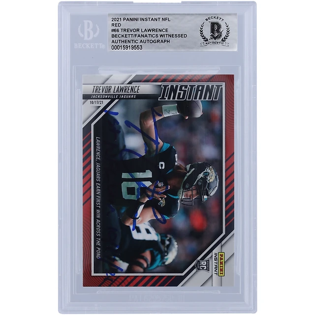 Carte de recrue authentifiée 2021 Panini Instant Red Variation #66 #/99 signée Trevor Lawrence Jacksonville Jaguars par les fanatiques de Beckett avec l'inscription « 1ère victoire NFL 17/10/21 »