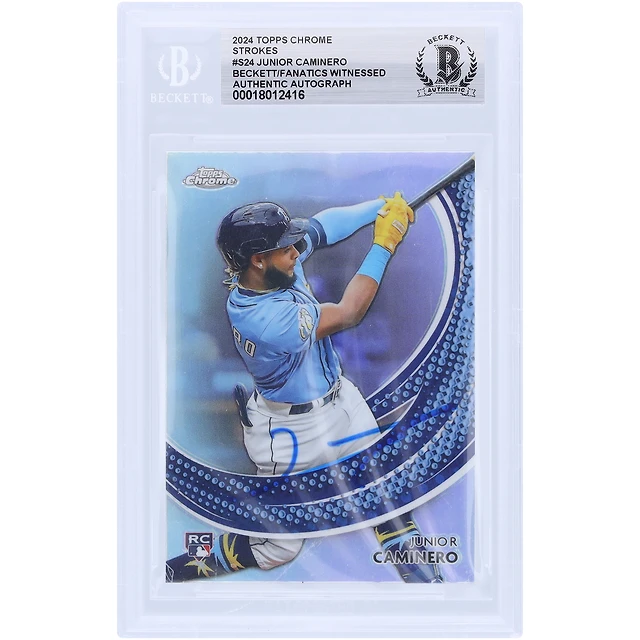 Carte de recrue authentifiée signée par Junior Caminero des Tampa Bay Rays, Topps Chrome Strokes #S-24, 2024, vue par les fans de Beckett