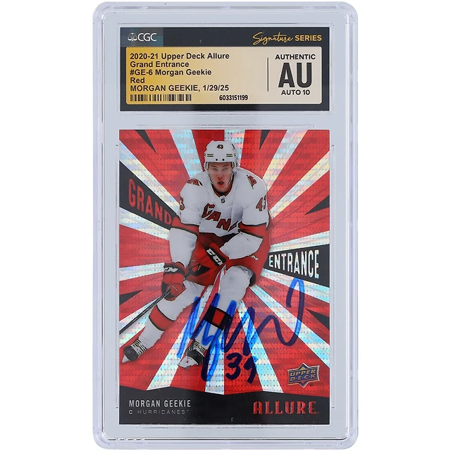Carte de recrue autographiée 2020-21 Upper Deck Allure Grand Entrance Red #GE-6 des Hurricanes de la Caroline de Morgan Geekie, carte de recrue Auto 10 authentifiée et témoin des fanatiques de CGC
