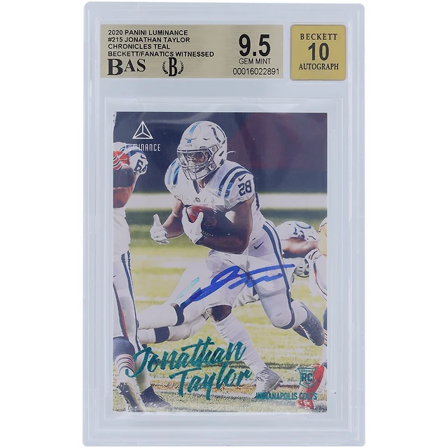 Carte de recrue autographiée 2020 Panini Luminance Teal #215 Beckett Fanatics Witnessed Authenticated 9.5/10 Rookie des Indianapolis Colts de Jonathan Taylor