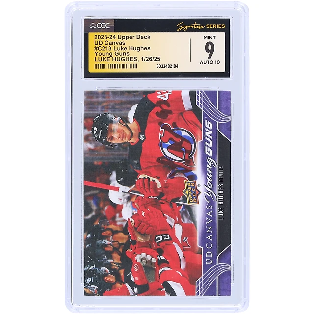 Carte de recrue autographiée 9/10 de Luke Hughes, Devils du New Jersey, Upper Deck Series 2, Young Guns, 2023-24, n° C213, CGC Fanatics, témoin