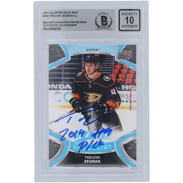 Carte de recrue numéro 10 authentifiée de Beckett Fanatics 2021-22 Upper Deck MVP #250 signée Trevor Zegras des Anaheim Ducks avec l'inscription « 2019 #9 Pick »