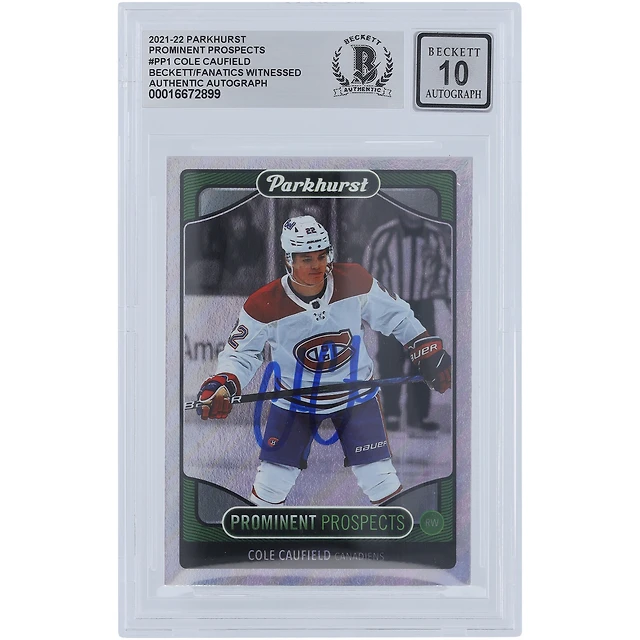 Carte de recrue numéro 10 autographiée par Cole Caufield des Canadiens de Montréal 2021-22 Upper Deck Parkhurst Prominent Prospects #PP1 Beckett Fanatics Witnessed Authenticated