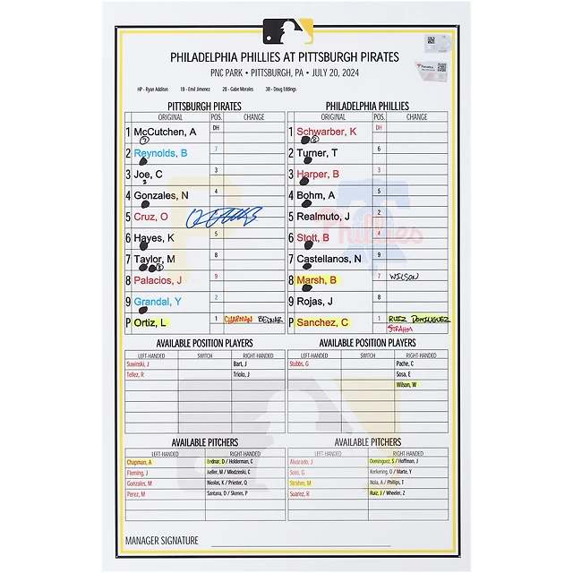 Carte dédicacée Oneil Cruz des Pirates de Pittsburgh lors du match contre les Phillies de Philadelphie le 20 juillet 2024