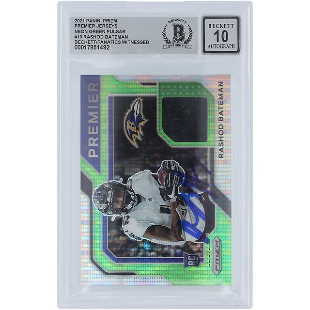Carte Panini Prizm Neon Pulsar Premier Relic #PJ-10 2021 autographiée par Rashod Bateman des Baltimore Ravens, carte Beckett Fanatics, authentifiée et témoin de l'incident.