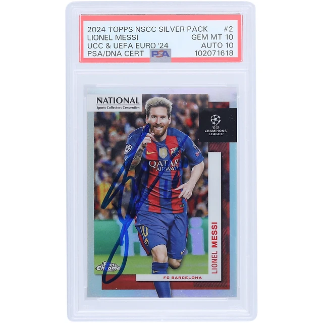 Carte PSA authentifiée 10/10 signée Lionel Messi Barcelone Topps Chrome National Convention UEFA #SC-2 2024