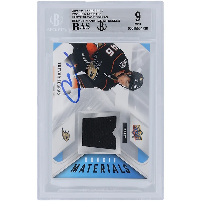 Carte recrue 9/10 authentifiée 2021-22 Upper Deck Series 2 Black Relic #RM-TZ signée Trevor Zegras par les Anaheim Ducks
